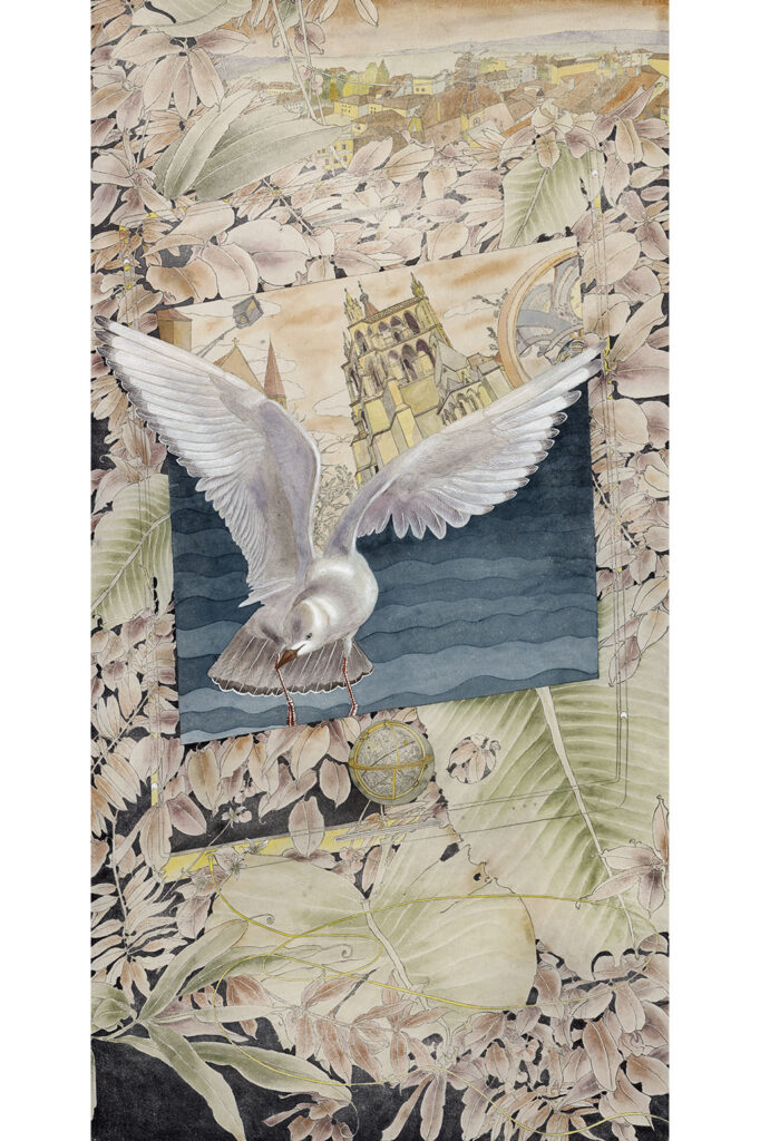 我产生了新的创作思路,利用时间、空间、科技来表达人类与家园的故事。我尝试用 “穿越”的理念,从时空转换的角度体察科技改变的生活。我将古代与现代重叠,强调东方与西方的碰撞。构思完落笔的时候,才发现这种思维模式涉及到元素颇多,会扰乱画面,从而割裂了画面的完整性。在画了三四十张小稿之后,用组合的方式,将构思与设色相近又不相同的几幅作品找到共性,再加以组合构成,实践证明这个方法非常适合我。