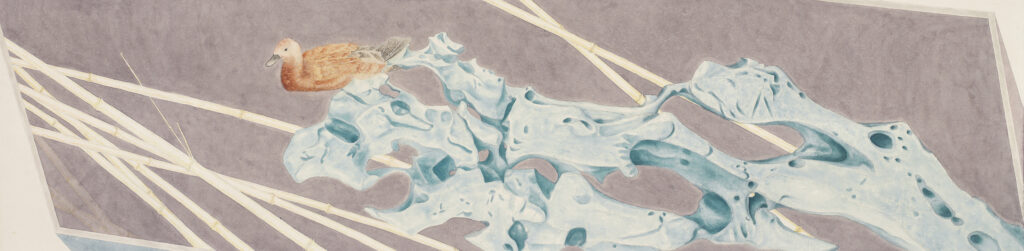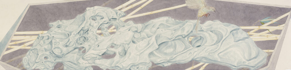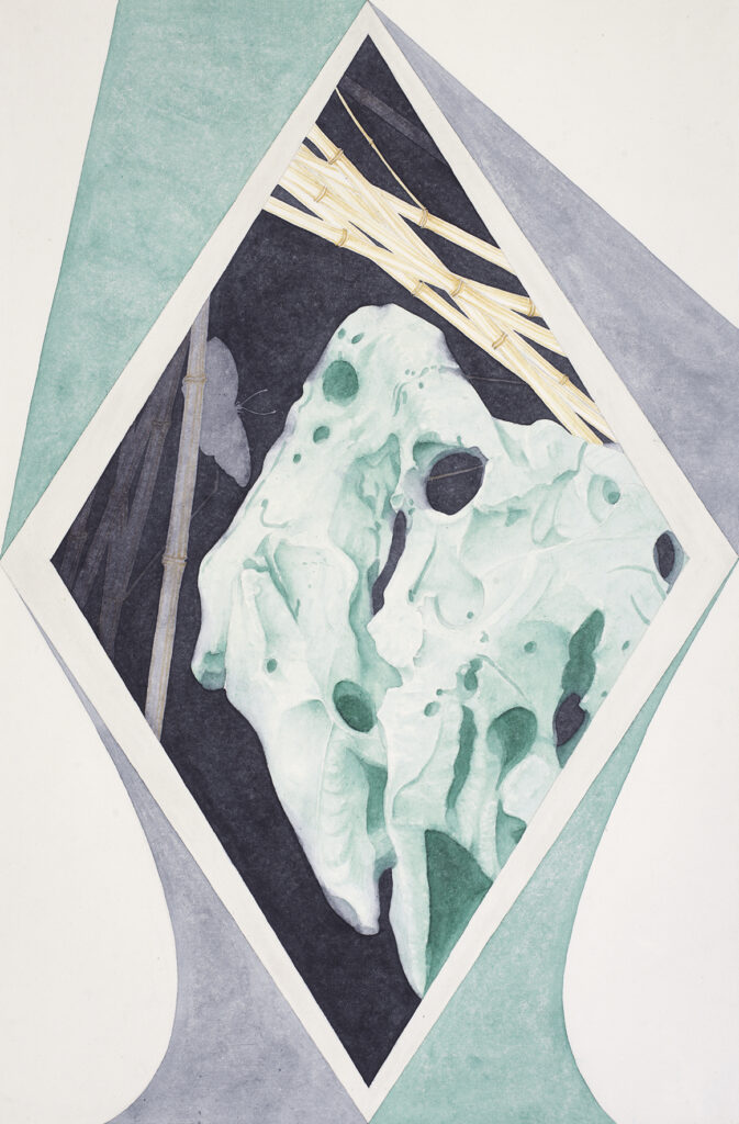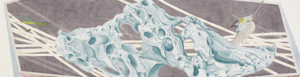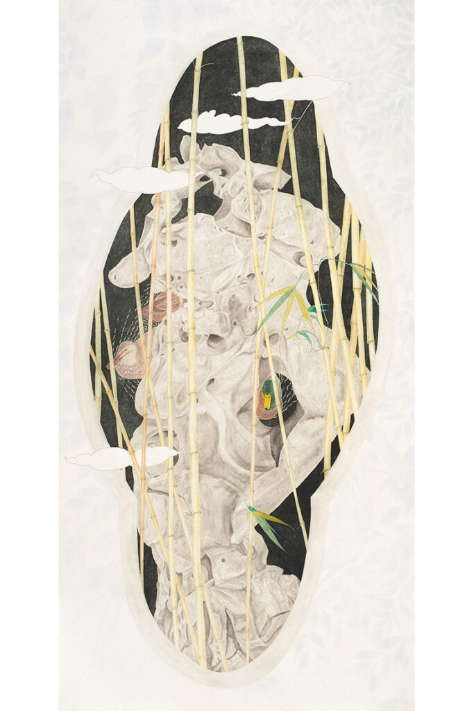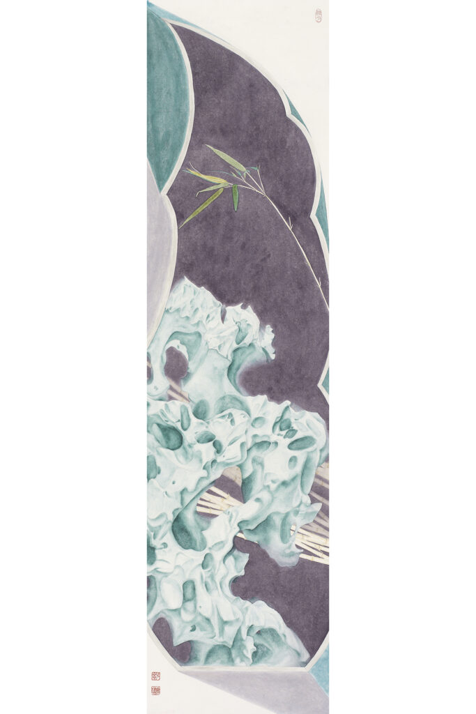 此时他选择了太湖石作为画面的主体,大刀阔斧的删掉不必要的画面元素,竹子此时成为最理想的次要物象,让其贯穿于画面中,留白则是给观者的想象空间。用空灵反衬真实,空灵与真实相互依托。让它们的关系可以比照星球和宇宙,真实的星球存在于浩瀚飘渺的宇宙中,共情共生。