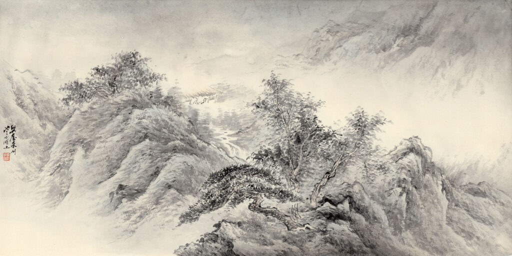 积墨法源于董、巨及二米,二米的“点滴云烟”以干墨积染,尤其是在纸本上会有许多滋润处。因而追本溯源对江南画格的画家来说从祖述上发掘出王维、董、巨、二米是最合适的本源。东洲所吸纳的养分正是江南画格的山水画。从他的《雨后空林》、《青山有于约》、《暖日晴风》等一系列作品中,皆可见江南的湿润使他的笔墨滋润在纸本之中。并在山水云烟中体会着平静淡远、精神自足的人生。东洲的作品,呈现了他所处认知阶段与追求,他让阅读他画的人领略了他的山水世界。