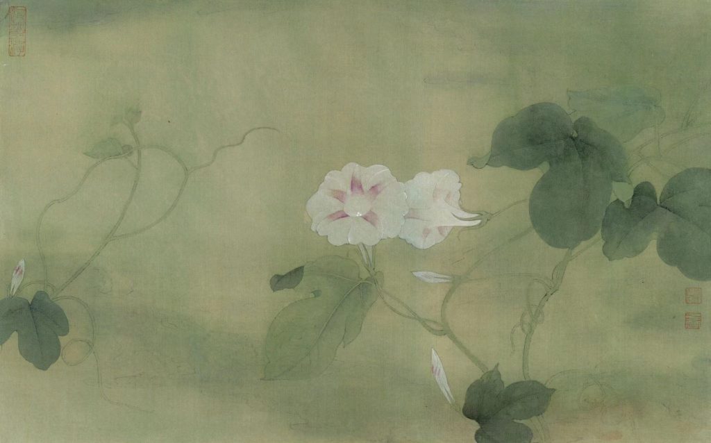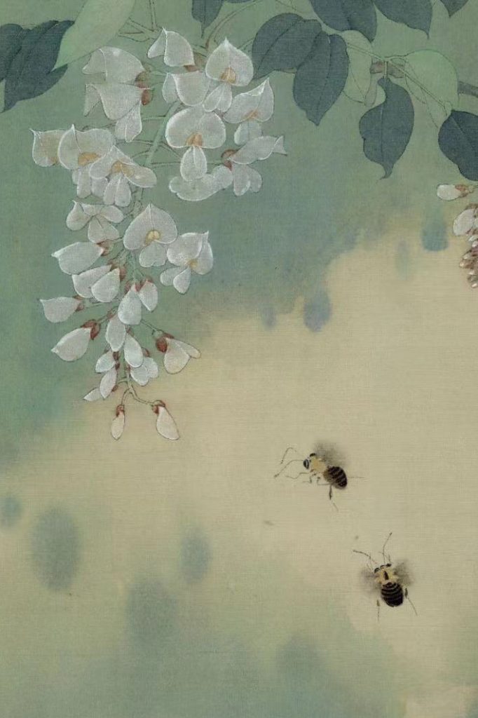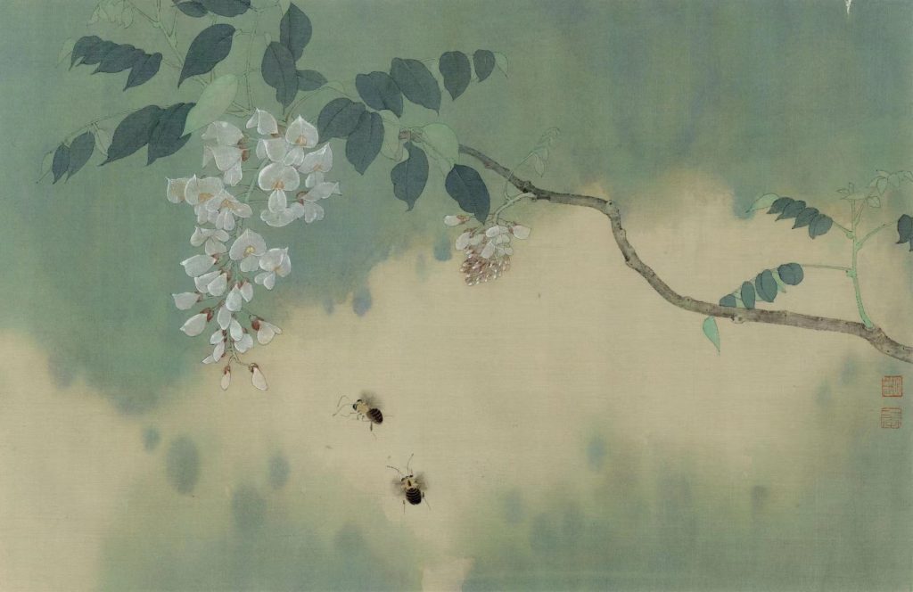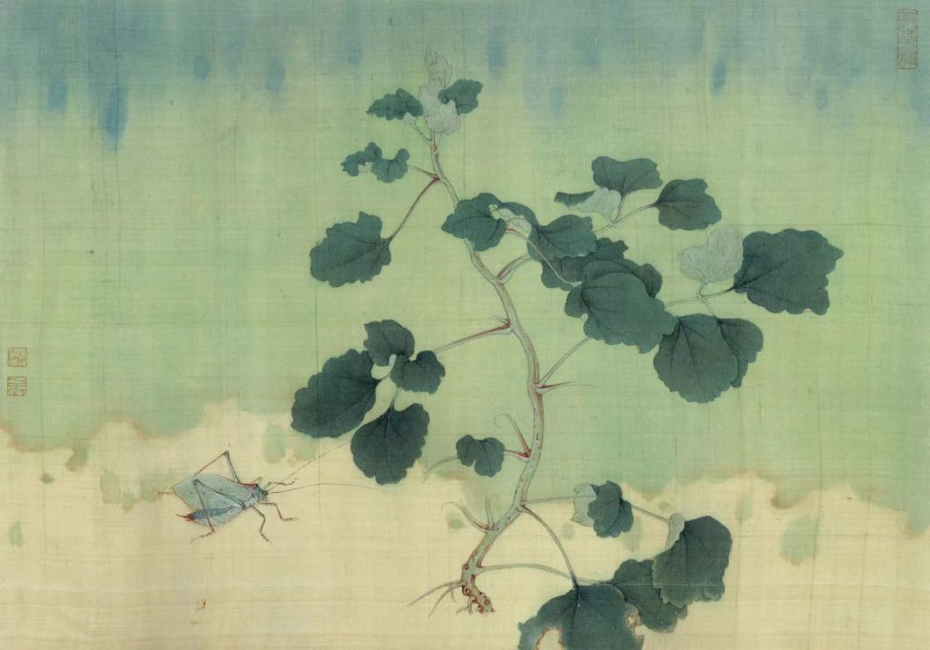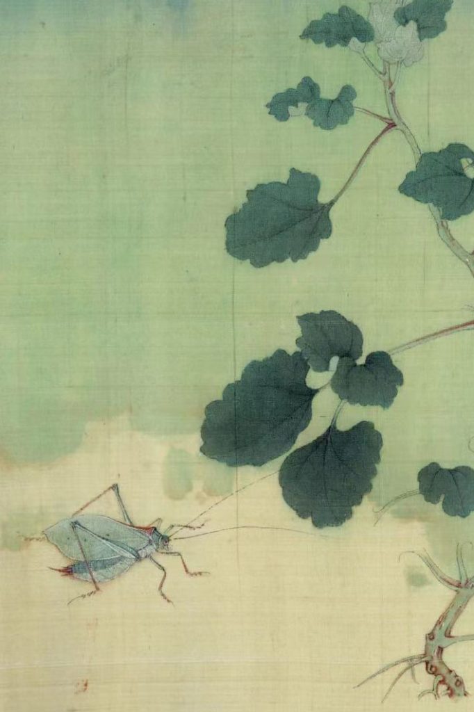丁学军的画有姿态,有趣味,又统一为一种隐隐闲情,有闲情就是好画。画有两种,一种是淡彩小写意,一种是工笔重彩。小写意以没骨画成,画得松软,那些花爱开不开,或是不在意开不或开。欹斜着身子站立,花瓣直接点染上去,只在叶脉上显示骨笔,画的时候很注重水的运用,所到之处都起了一片浓荫,那个小虫就趴在一片浓荫里。工笔重彩是他的一个代表系列,采用勾勒填色,但由于勾线谨细,渲染自然,已不显得刻画之痕,反而生动鲜活不失隽永。比起淡彩的随意舒展,笔更有旧味儿,运笔敷色更见精微,花形用线勾勒,分层晕染,洞之微毫,把视角变成秋虫一样平等,画里的节奏和意境就出来了。现在很多创作都来自他的写生本,画的都是平常的花,藤萝、牵牛、茉莉、栀子、芍药……早期写生只是写生,后来就直接写出造型来,其中的转换就在于,从写生转到绘画上。一簇白藤萝,上面斜生着一簇花,下面一堆散叶子,这个造型不好把控,但是他调整得很好,结构布局非常自然,又不显得随意。画草虫不是依貌写貌,而是对于草虫的动作都了然于心,再去动笔,笔下就有了动感。草虫依草而生,十分刚健,颜色上是自然的草绿、麻黄、浅褐,还有美丽的花纹,它的身体十分饱满,腿脚修长有弹性,这个活泼劲儿不容易画出。虽然画得慢,但并不匠气,以笔墨的变化消解了老套,反而变得十分耐看。一张一张看下去。螳螂的腿和松塔上的松针都是好看的线条,一个劲健,一个流动。牵牛的叶子与蝈蝈的肚子一样肥,又在枝蔓与腿的线条上收得很瘦。茉莉花白的发粉,幽香袅袅,蝴蝶盛装以待。都是好看的颜色。一只蚂蚱站在草叶上,孤独满足,天地只有他一人。一大串槐花引来蜜蜂,似乎都能听到它们振翅的频次,热闹孤单都很好。深调子的画有一种潜在气质,旧旧的,好像褪了一点色,墨骨还在,那花还是肉嘟嘟的。我喜欢这样的传统,气息特别正,从气息到方法,都是从古人那里来的,加上自己的体察,画里就有品味了。之所以画得这样细腻,在于艺术家对生命、对世间万物的眷恋。有草的地方就有虫,有虫的地方也有花,我们为秋虫找到了理想的栖息地,实际也是为自己的心找到一个栖息地。美是生活,有趣是生活,闲情是生活,这就是丁学军营造的草虫生意。