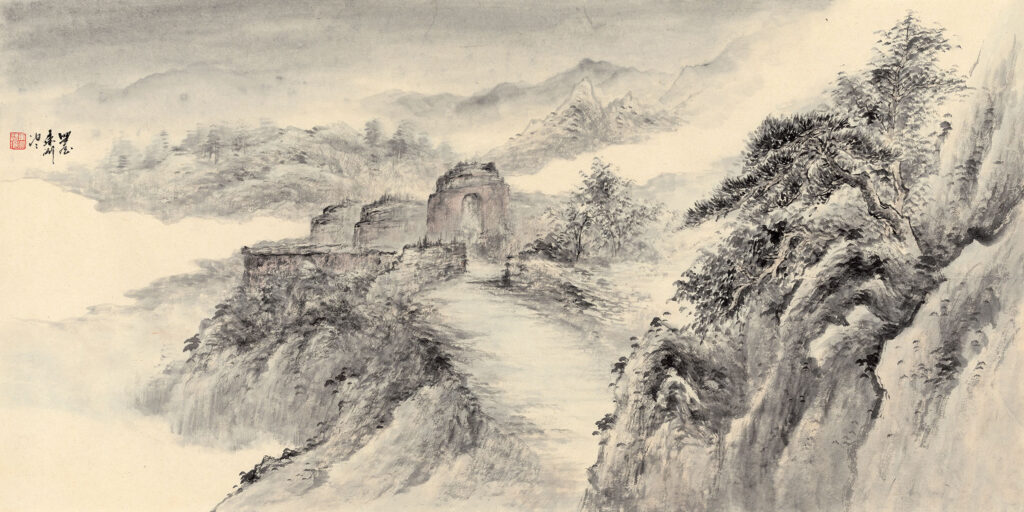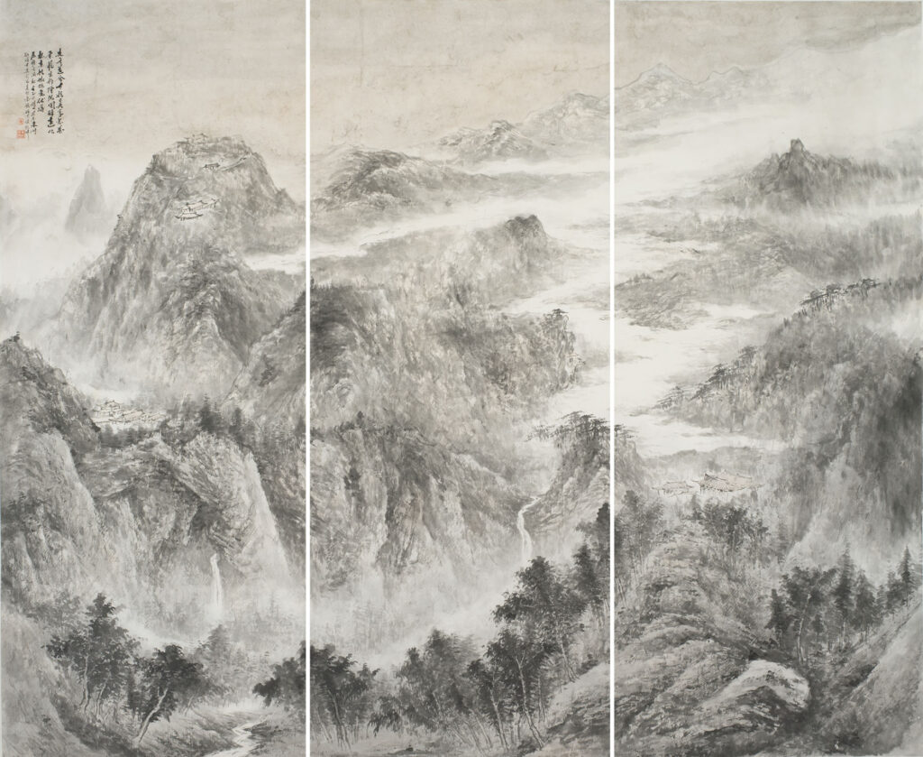 积墨法源于董、巨及二米,二米的“点滴云烟”以干墨积染,尤其是在纸本上会有许多滋润处。因而追本溯源对江南画格的画家来说从祖述上发掘出王维、董、巨、二米是最合适的本源。东洲所吸纳的养分正是江南画格的山水画。从他的《雨后空林》、《青山有于约》、《暖日晴风》等一系列作品中,皆可见江南的湿润使他的笔墨滋润在纸本之中。并在山水云烟中体会着平静淡远、精神自足的人生。东洲的作品,呈现了他所处认知阶段与追求,他让阅读他画的人领略了他的山水世界。