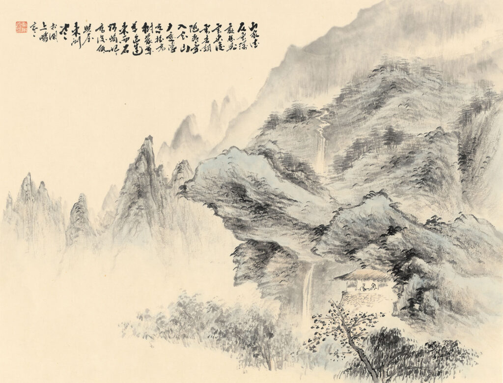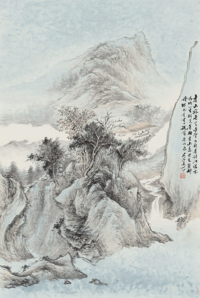 在用笔上,东洲很注重一种松动轻灵的体验。这种用笔体验从元人传统而来,到明清文人画那里发展到极致。在点叶和皴法的用笔处理上,他成功传达出内心中悠游自在的情感,下笔时见破笔散锋,但精神爽健,很好地将散淡的情绪与笔触的偶然效果结合起来。在此基础上,他通过有针对性的积皴积染,使得墨色层次丰富而苍润。黄宾虹说画画筑基于笔,而建勋于墨。东洲擅笔法固然可贵,但更可贵的是他能藏笔而做到墨法浑融。