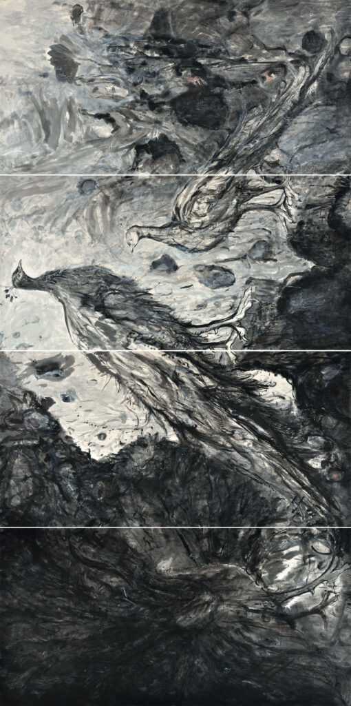 水墨艺术走到今天是喜是忧可以各自判断。但是我们的艺术被传统问题和西方问题纠结了一百余年这是事实,直至今天,似乎并未摆脱这种状态而走向真实的自己。50后如此,60、70后亦如此。所不同的是在70后的画家中自主意识和个性化追求明显与前代画家有所不同。赵飞作为70后画家在创作过程中所展现出来的状态就带有这种差异。在实践中不断地发掘自己,找到属于自己的那个地方,以此作为自我表达的依据。他喜欢画大幅作品,喜欢过往的故事、事件或者曾经发生过的,让画面空间和笔墨更多地呈载自己的经历,这也是赵飞创作行为的特征和本色。从他早期创作的《它们》系列作品中,画面以一只倒挂着的鸡的形式出现,到后期的孔雀,还有一动物的描绘,赵飞从视觉入手,采用夸张变形的设计方式,使画面的主体形象更加清晰强烈,技术运用厚重得体。笔墨方式多采用积墨法,积墨中又掺杂着泼墨,淡墨与浓墨交差、重叠,复勾再重叠,使形象的质感上升为一种厚度,同时对感觉和语言的把握也趋于成熟与合理。赵飞善于思考,勤学肯钻研,在笔墨方式与造型手段研究上作了大量有价值的探索。他认为“画面的最终结果是内心感受的印记,它应该符合画家的个性方式和内心体验。因此我们的艺术语言应该得到更加宽泛的解释,围绕着形式与表达展开更具体、更深入的分析与尝试。”赵飞把贴进生活靠近理想一类的表现物,在归纳整理时,他的目的性便直接指向了思考的深层。那些内心的起伏自然被拓出印痕,有较强的意味性。形式感虽然是简约的,但墨和色的运用就不一般了,这里不一般是指墨和色的倾向有些细微的差异,从繁杂向简单跨越的过程中,有许多类似“感觉”类似“形态”生发出来,非常符合思考与辨析的规律,这种认识往往取决他对于绘画“形态”的把握。一个画家要走自己的路不外乎寻找可驾驭的语言。但究竟怎么做是一定有规律可寻的,赵飞创作的《它们》系列和《方便时代》、《封存》系列以及《EGYPT·2006》系列作品有异曲同工之处。这些作品的意义就在于,它解读了中国传统文化和现代生活方式不同的途径与取向。如果回望这些年来的中国绘画的探索与创作,可以说赵飞的绘画作品在探索中充分体现了他的努力和价值。
