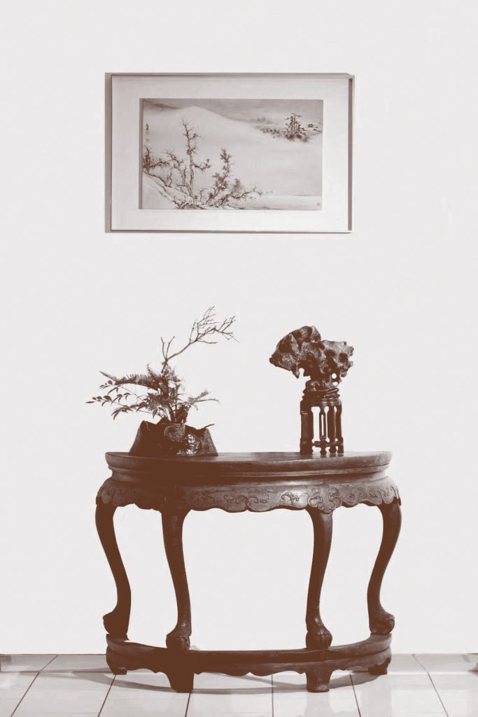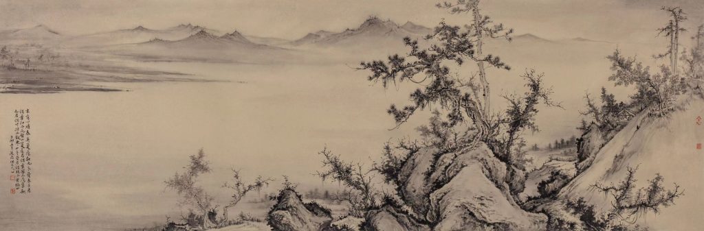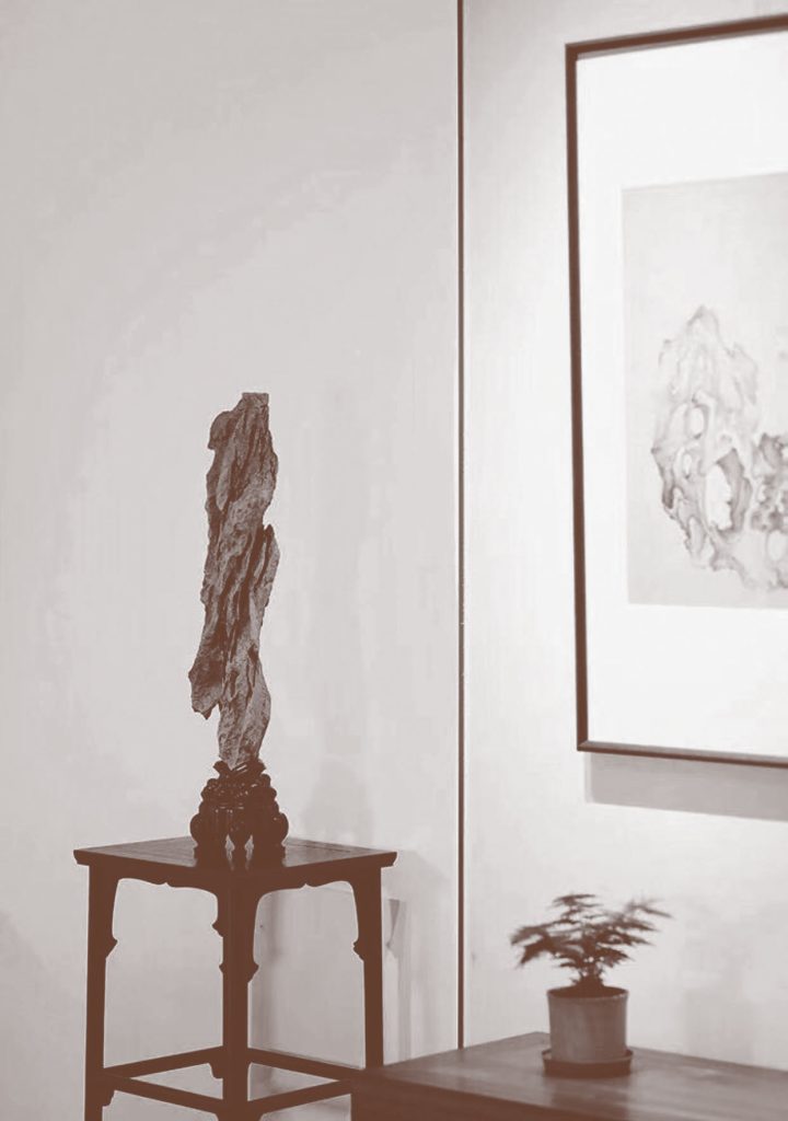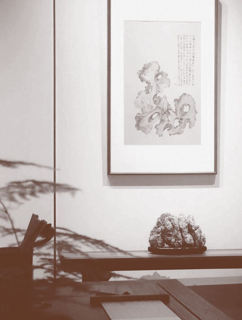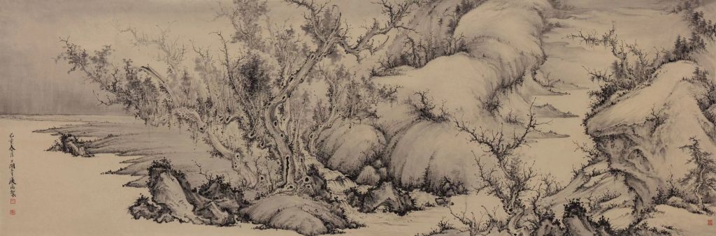 入静时,用心体会,形始备焉。枝桠婉转,一曲三折,皴法配合,点线得宜。近写树,仅只一棵,寂然立之,有性灵贯穿其间。中景略皴一二,石之形向背有异,疏密配合,远景则淡墨渲染,轻描实写,三远始具矣。观其树身,观其山石,造型别致,是有真性灵在。画树画石,笔法如一。