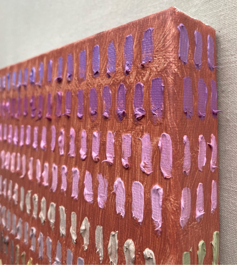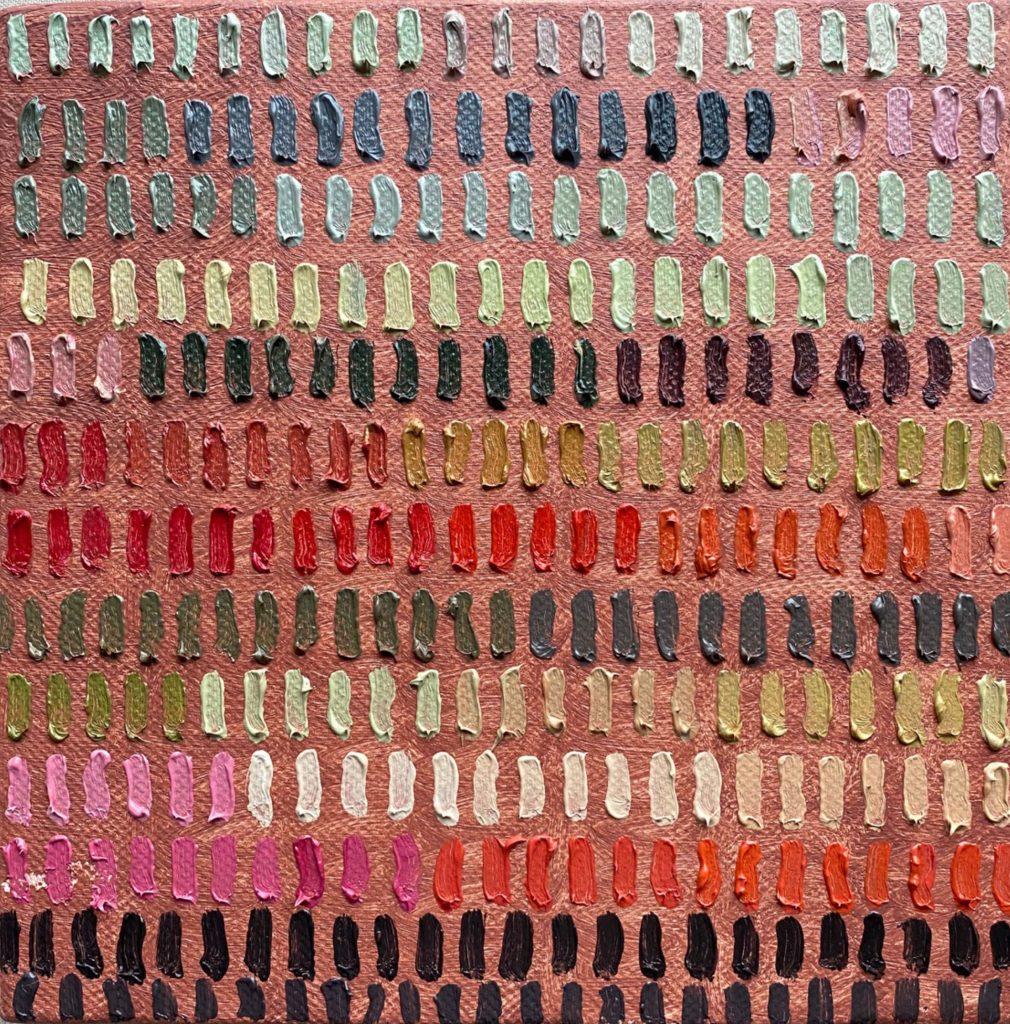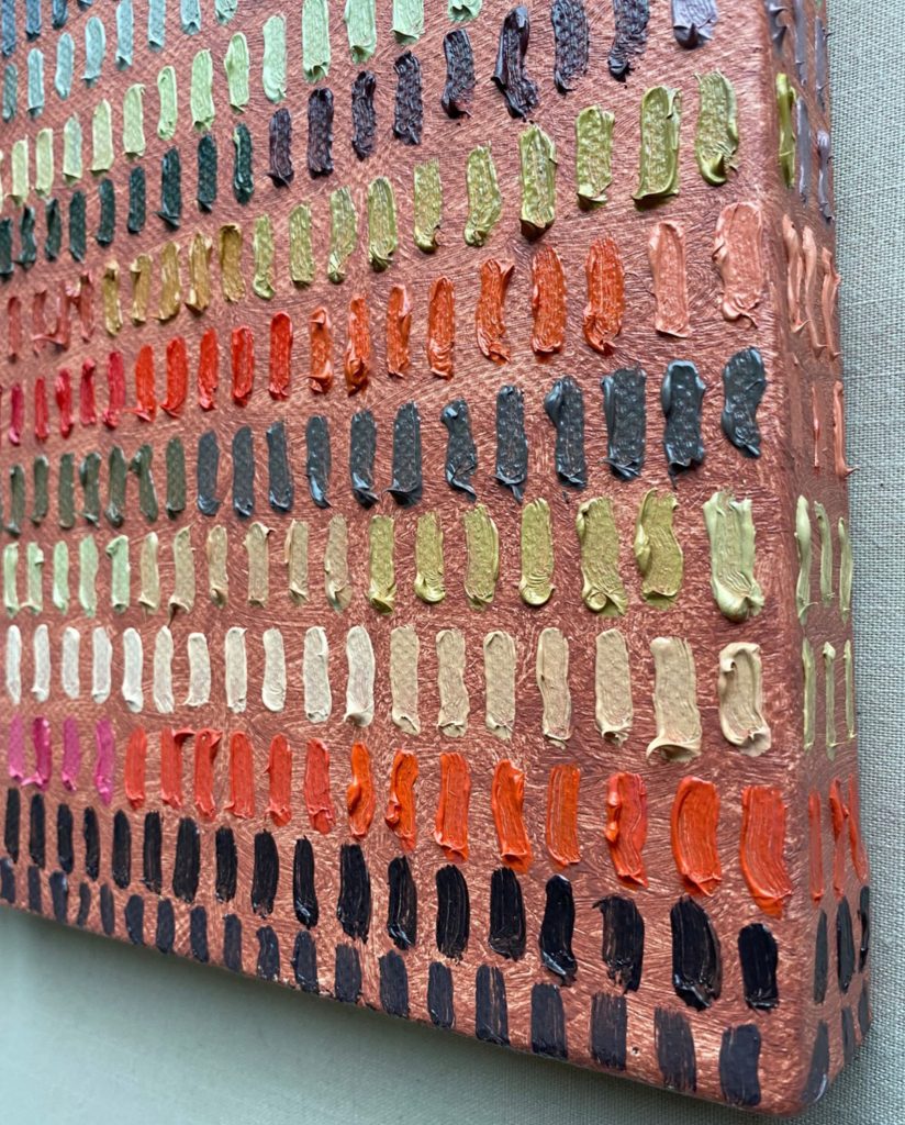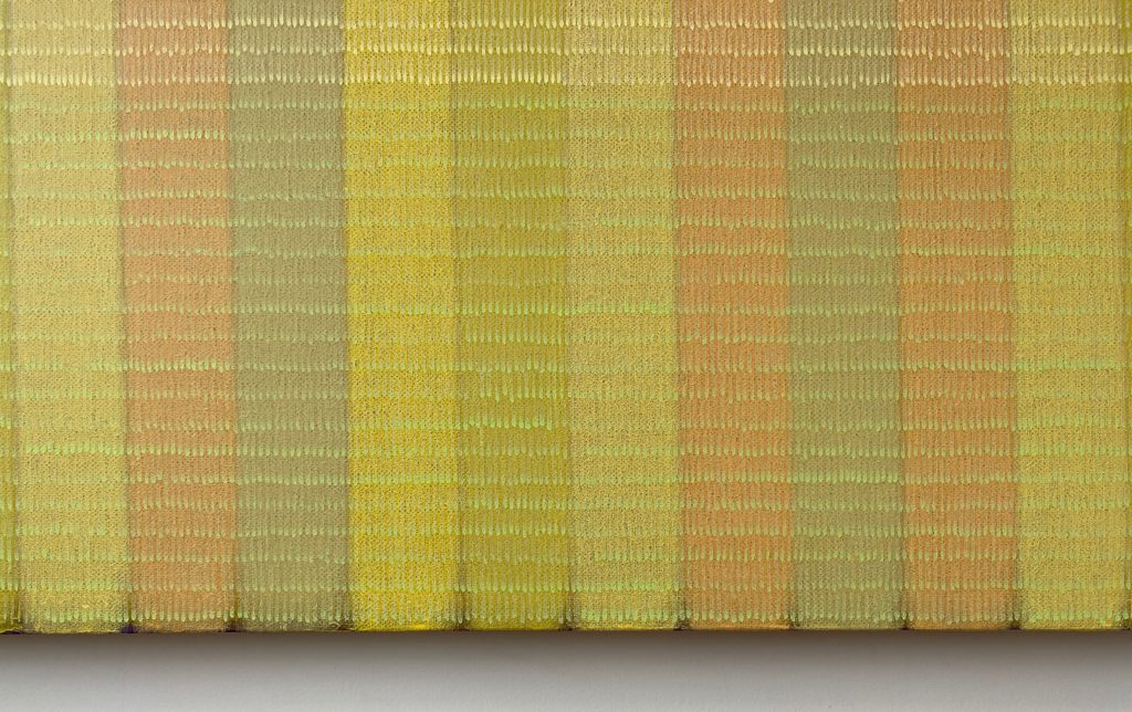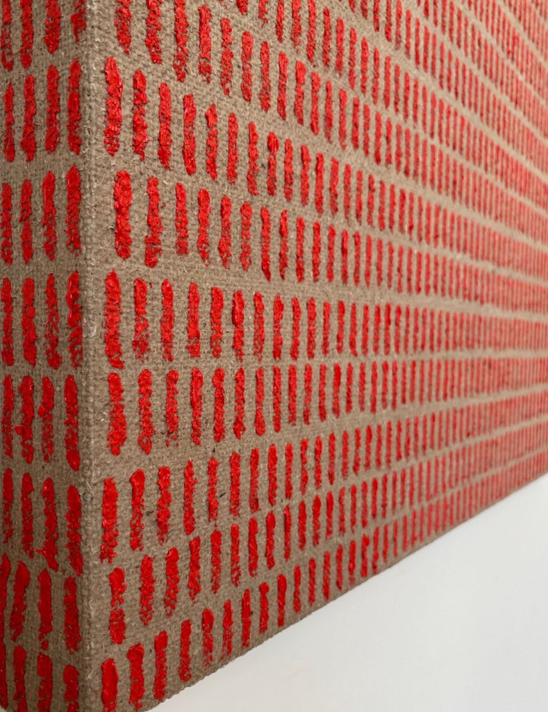 2003年,周洋明参与了著名策展人栗宪庭的展览《念珠与笔触》。栗宪庭敏锐感知到了这个新世纪之初的艺术现象:以“重复”这一手法来重获内心平静。在参展艺术家中,周洋明是少数几个至今依然保持纯粹重复笔触的艺术家之一,正如当时展览名中“念珠”隐喻的那样,持续念诵是修行中一个最易入门、但也最难坚持不辍的法门,在周洋明长达二十余年念珠般的不懈笔触中,他的笔触从最初极致纤细、乃至藏于布缝之间的“隐”,渐渐如生命般生长,走向了茁壮无遮、袒露本质的“现”;这样的变化不仅是去饰般的坦率,更来自一种以本质为力量,足以面对任何真实的勇气。
