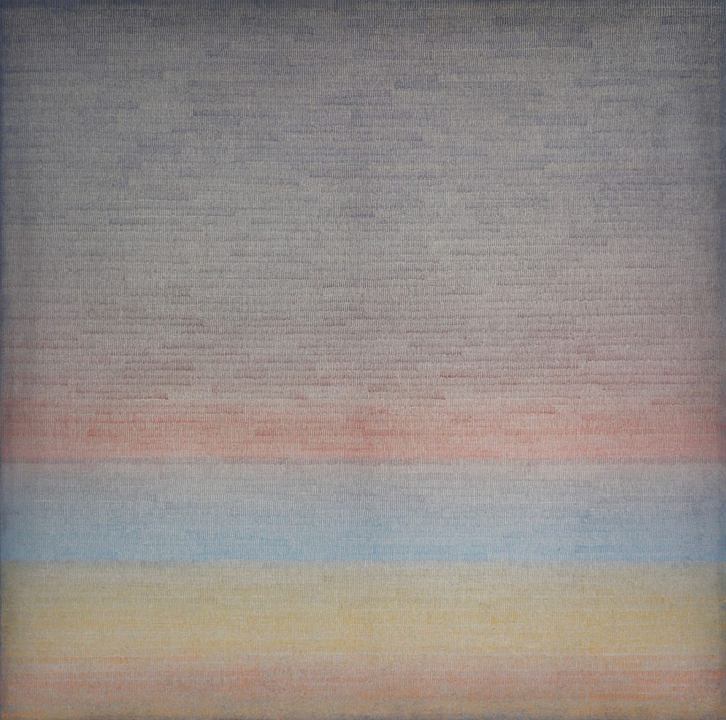 他执着得近乎偏执。自90年代末至今,二十多年来的每一天他都在画布上做着重复的工作:画下如“1”般的一道,又一道,不厌其烦,永无止境,如西西弗斯般奔赴无尽的宿命;他选择“赤裸”,选择了一笔不改的创作方式,每一道笔触都是他无可遮蔽的真实当下,如走钢索般屏息落下审慎的一笔,西方艺术家常惊异于他不借助任何工具却能精准如矩;他有重度的创作洁癖,创作前不仅洒扫工作室,更必须将自己置于杂念与纷扰之外,时刻警惕着自己落入惯性的陷阱,保持机警的觉知,却向未知全然敞开。艺术对于艺术家意味着什么?这个选择展现了艺术家的真相:艺术是艺术家获得愉悦、释放的出口,还是一场寻求真理的持修苦行?在这个艺术品价格决定价值的时代,还有多少人会相信,艺术不仅是消遣、投资,还可能是一个对良知负有责任的壮举?当下充斥着尼采预言的“末人”(Last Man),将自我投掷于虚妄的感官享受中不知餍足,“崇高”和“理想”这样的词汇已变得陌生,静默与庄严只属于越来越少的灵魂,无法满足日益麻木的重口厚味。但显然,周洋明用日复一日的执拗和清理,走向了那条静默的路。最简单的一道线,任何人都会画。周洋明选择在中国当代艺术走向浓重商业化的新世纪交界点,放下吸引眼球的奇技淫巧,放下“这么简单也是艺术吗?”的他者质疑,用一道线,开启绵绵无绝期的反对——反对“艺术必须超常”、“艺术对常人不可及”的创作观念,更反对“看不见”等于“不存在”的实用主义。威尼斯双年展策展人奥利瓦这样评价他:“周洋明作品中转喻的使用和选择产生于深刻的政治意识,周洋明的作品代表一种持续的反对,这种反对作为一种在现实和艺术语言的矛盾的不可化约性的良知而存在。”