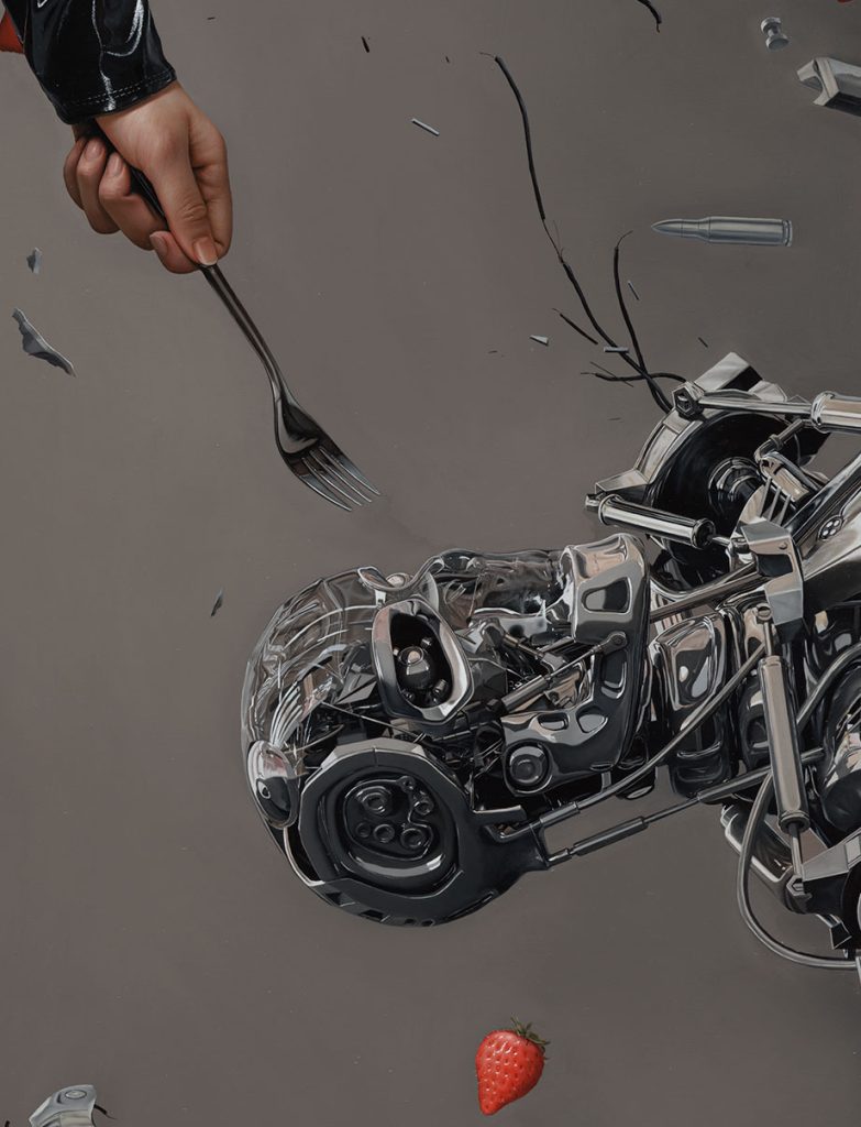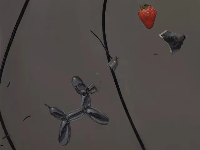 这幅画最不寻常的部分可能就是爆发于整个场景中的一系列草莓了。在基本都是灰度图的背景下,这些鲜艳的红色水果以一种惊人的方式突然出现在观众面前。周松将草莓比作心脏,在2011年对这一水果进行了一系列大规模的详细研究。除了形状和颜色之外,草莓也一直与爱情和浪漫相联系,正如沃尔特·吉布森所说,它们是维纳斯的水果。吉布森在他的文章《希罗尼穆师·博斯的草莓》中详细介绍了中世纪和文艺复兴时期的艺术品是如何运用草莓,并将它们作为各个层面上的复杂符号的。他的分析以博斯著名的《尘世乐园》(c.1500)为基础,这幅画中草莓以各种大小出现在画面中间。考虑到对这幅作品的分析存在冲突,吉布森指出草莓有助于把这幅名画描绘为伊甸园和地狱之间的场景。他还特别提到了劳伦达·狄克有关草莓在中世纪医学中的运用的讨论,在早期他们暗示其为“死亡和复活的炼金寓言”。与周松将草莓作为心脏的想法相结合,这幅油画显然体现出了一种生物控制论:作为一个明显的有机物体,它迅速成熟,更加速衰败,草莓象征着画面主体人物中心机械元件的脆弱性。与构成背景的其余金属部件产生鲜明的对比,草莓也象征着对无机元素所代表的科技未来乌托邦的反对。草莓的鲜活与中心人物紧密相连,该人物是画面中除了草莓以外唯一有颜色的部分。