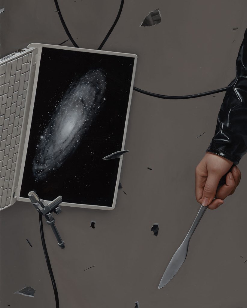 欣赏这幅画的终极挑战在于思考主角是否确实是人类。作品真人般的大小和照片般的细节让这一女性形象与观众之间产生联系。她的形象绝非理想化:脸颊上有雀斑,头发开叉且造型随意。这个作品不仅仅是一幅油画,它更像是一扇通往未来世界的大门,也许可以带领观众进行一次时间旅行。然而,作品还是存在一些紧张的成分,让整个欣赏过程稍显不安。她参考的数字朋克和科幻片往往带有一个叙述性原型,角色必须努力去探索自己的身份到底是人类还是机器人,但这种挣扎的结果往往是失败而不是得到答案。例如,在雷德利·斯科特1982年导演的科幻电影《银翼杀手》中,瑞秋是一名复制人,她的程序中被植入了记忆所以认为自己是人类。在她开始认识到事实的真相时,电影的主角瑞克·戴克爱上了她,并因此引出了有关跨越人类和机器人之间界限能力的问题。