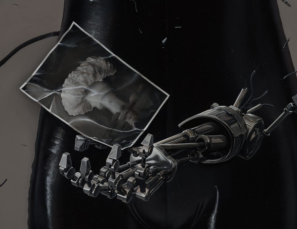 东西方之间的张力在作品中反复出现,进一步强调了他们与人物之间的复杂碰撞。例如,人物的双手握着一副刀叉。虽然表面上看这是一种危险的信号,但它也体现了东西方之间餐具的区别。刀叉作为金属工具也与作品中其他闪亮的科技产品等同,并表达出一种西方工具的进步感。油画中的档案照片也起到了类似的作用。例如,登月被置于全球太空竞赛的背景当中,并将美国作为技术进步和人类发展的领导者,从而成为了西方话语的中心地带。有趣的是,在周松绘制的照片中,奥尔德林肩膀上的一枚美国国旗小徽章被遗漏了。同样,核试验的照片也与西方对东方制造的核战争暴力有关,最明显的是二战后期即1945年发生在广岛的原子弹事件。