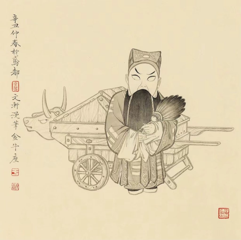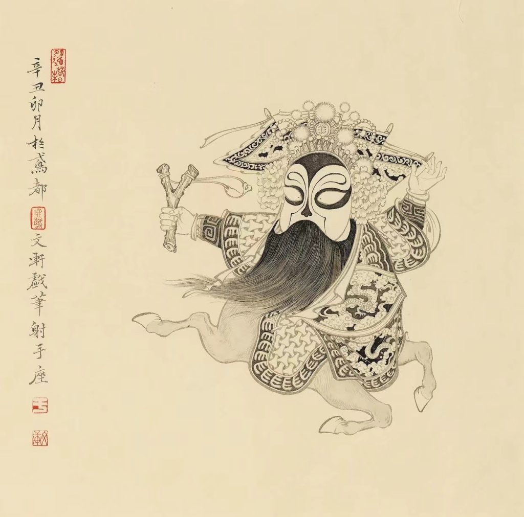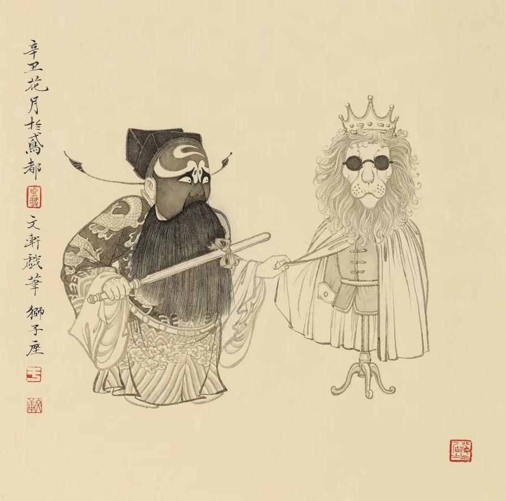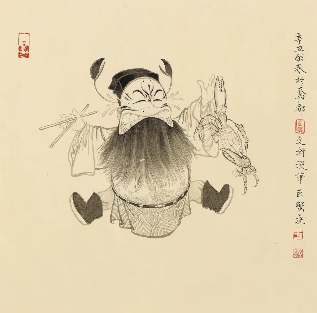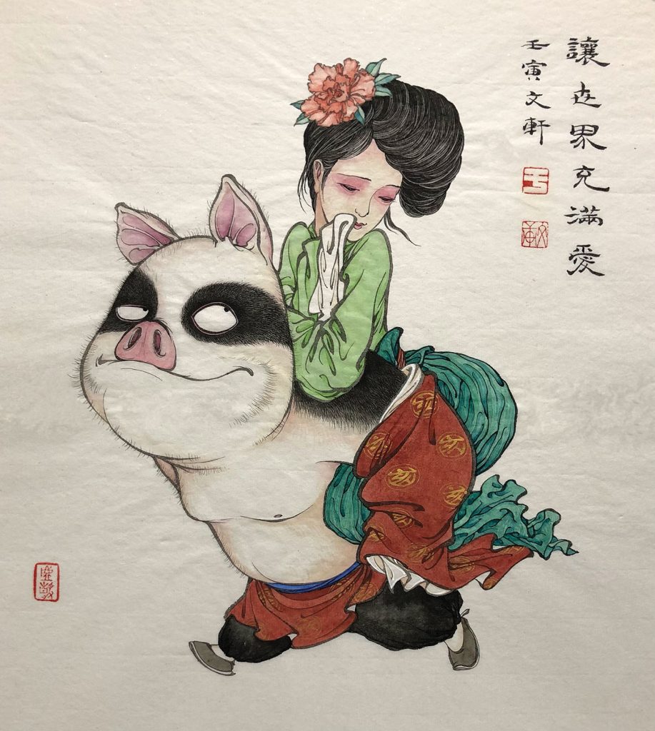 渐进不惑之年,若还不信命,只能说参悟不精,处世不深。年轻人是绝不信这套迷信蛊惑之词的。以前我也如此:一个人的成功定是自己奋斗的结果;追求理想对象,也一定是通过不懈努力而得。然大疫三年以来,通过身边的巨大变化,开始思考……有些人水平、智力、意志、品质都远不如己,却少年得志平步青云……出身、门第这些儒家早已给出了答案。孔子说“不知命,无以为君子”。人的富贵,贫贱跟人生意义无关,无论处境何地,都要活出生命的精彩。按照命理学解释即八字已注定,认同知命。再看当下的房奴,躺平,剩男剩女,子女教育……沉沉浮浮,云云如是。富贵并不等于幸福,贫贱亦不等于痛苦,兴之所至,心之所安,勿谋虚逐妄,君子真乐,皆自内心。 命理即八字,八字对干支,生肖文化历经千年至今,从出生便与每个人发生关联,也是历代画家所热衷表现的题材,把动物生肖人文符号化,以当下热点话题解释对命理的理解,感悟,多拾人牙慧。付诸笔端,才是创作之初衷。 至于画面的荒诞形式感,源于2021年《戏剧化丹青》展览。用京剧中的生、旦、净、末、丑经典戏剧形象,表现西方的十二星座,漫画的幽默性,讽刺性,反衬现实生活,又更直观诠释画面。无论西方的星座还是东方的生肖文化,都是总结命理规律,让人看清自我,热爱生命,活出精彩。· 生肖 ·