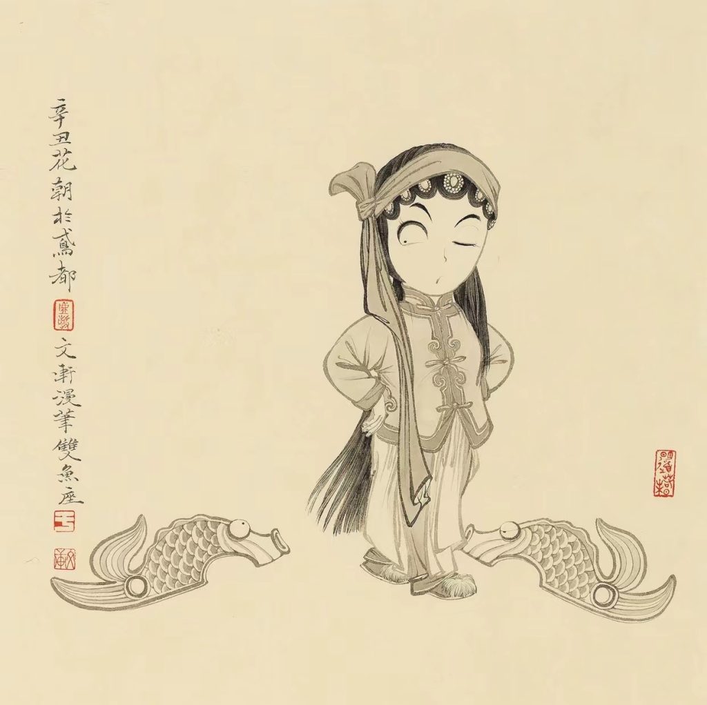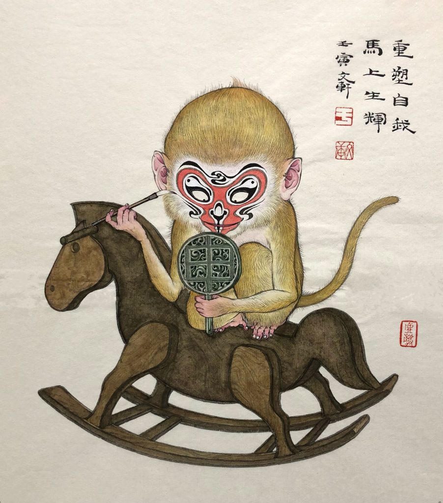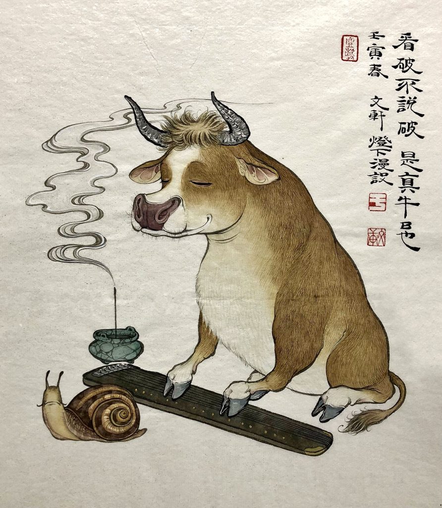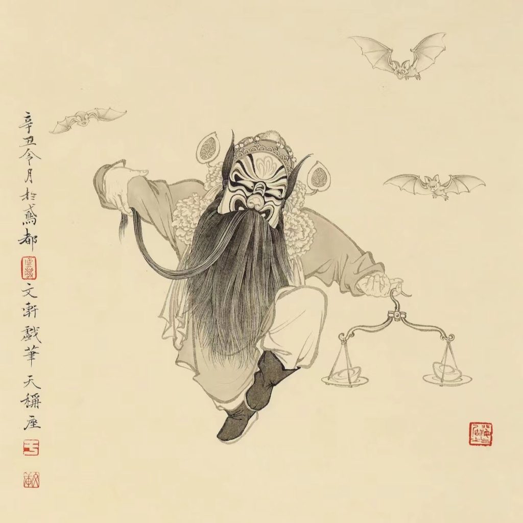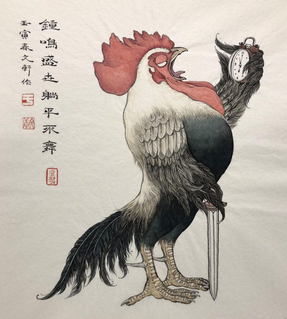 渐进不惑之年,若还不信命,只能说参悟不精,处世不深。年轻人是绝不信这套迷信蛊惑之词的。以前我也如此:一个人的成功定是自己奋斗的结果;追求理想对象,也一定是通过不懈努力而得。然大疫三年以来,通过身边的巨大变化,开始思考……有些人水平、智力、意志、品质都远不如己,却少年得志平步青云……出身、门第这些儒家早已给出了答案。孔子说“不知命,无以为君子”。人的富贵,贫贱跟人生意义无关,无论处境何地,都要活出生命的精彩。按照命理学解释即八字已注定,认同知命。再看当下的房奴,躺平,剩男剩女,子女教育……沉沉浮浮,云云如是。富贵并不等于幸福,贫贱亦不等于痛苦,兴之所至,心之所安,勿谋虚逐妄,君子真乐,皆自内心。 命理即八字,八字对干支,生肖文化历经千年至今,从出生便与每个人发生关联,也是历代画家所热衷表现的题材,把动物生肖人文符号化,以当下热点话题解释对命理的理解,感悟,多拾人牙慧。付诸笔端,才是创作之初衷。 至于画面的荒诞形式感,源于2021年《戏剧化丹青》展览。用京剧中的生、旦、净、末、丑经典戏剧形象,表现西方的十二星座,漫画的幽默性,讽刺性,反衬现实生活,又更直观诠释画面。无论西方的星座还是东方的生肖文化,都是总结命理规律,让人看清自我,热爱生命,活出精彩。· 生肖 ·