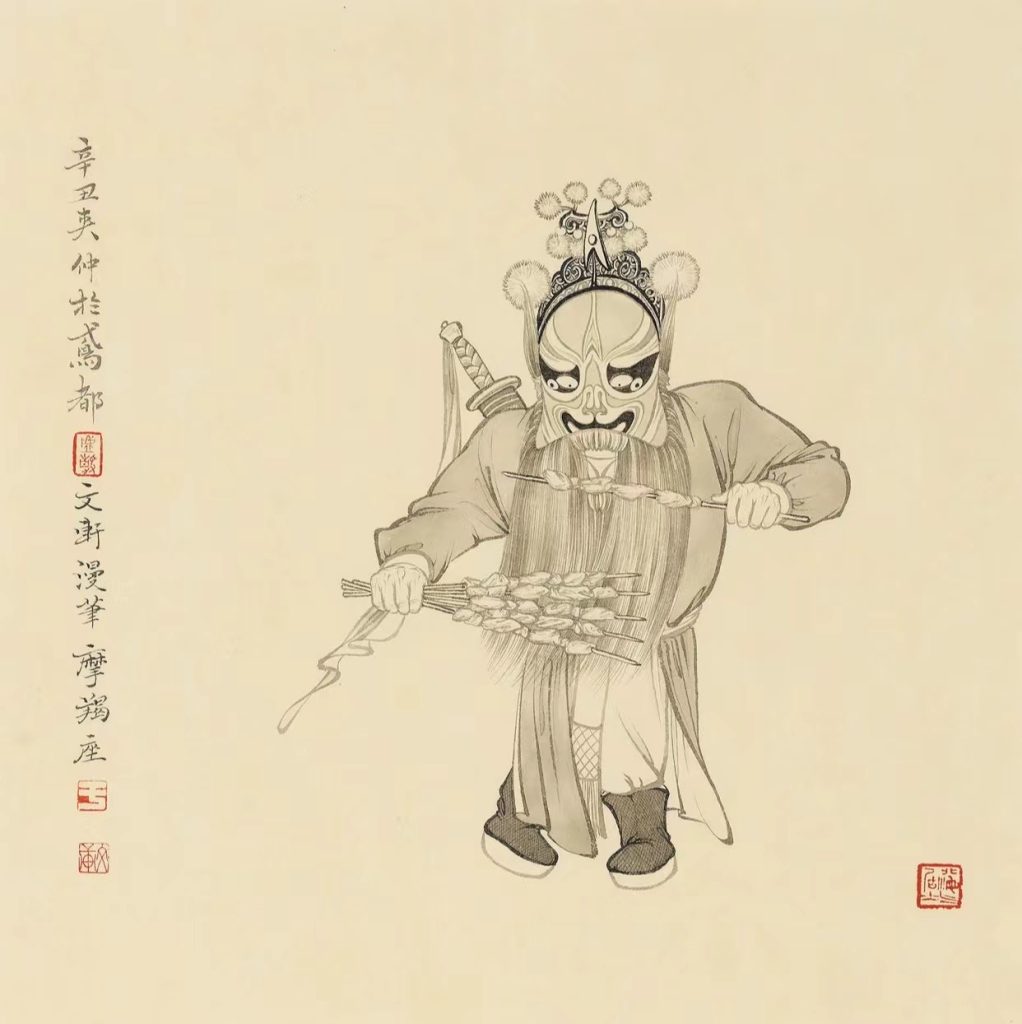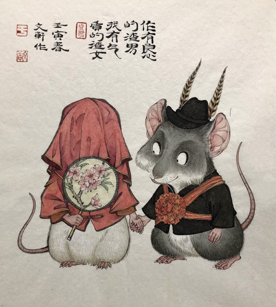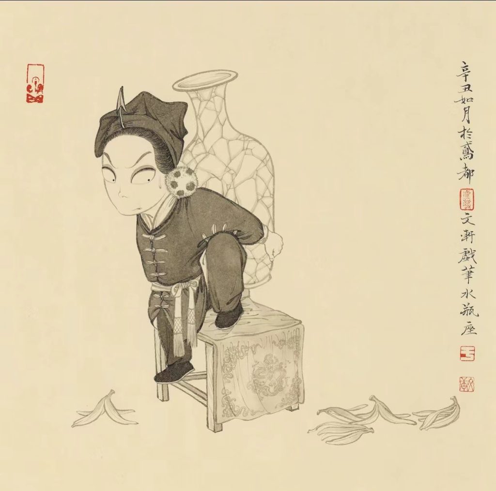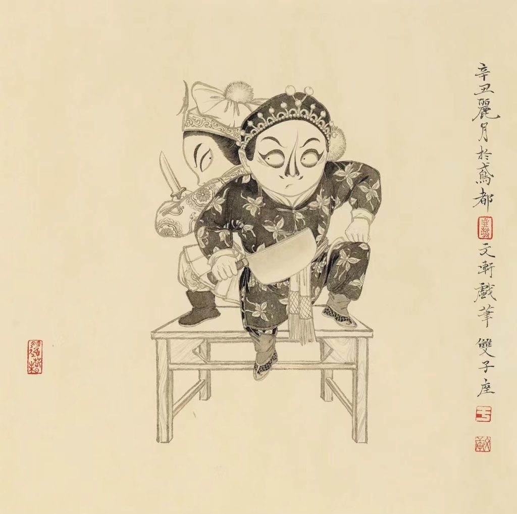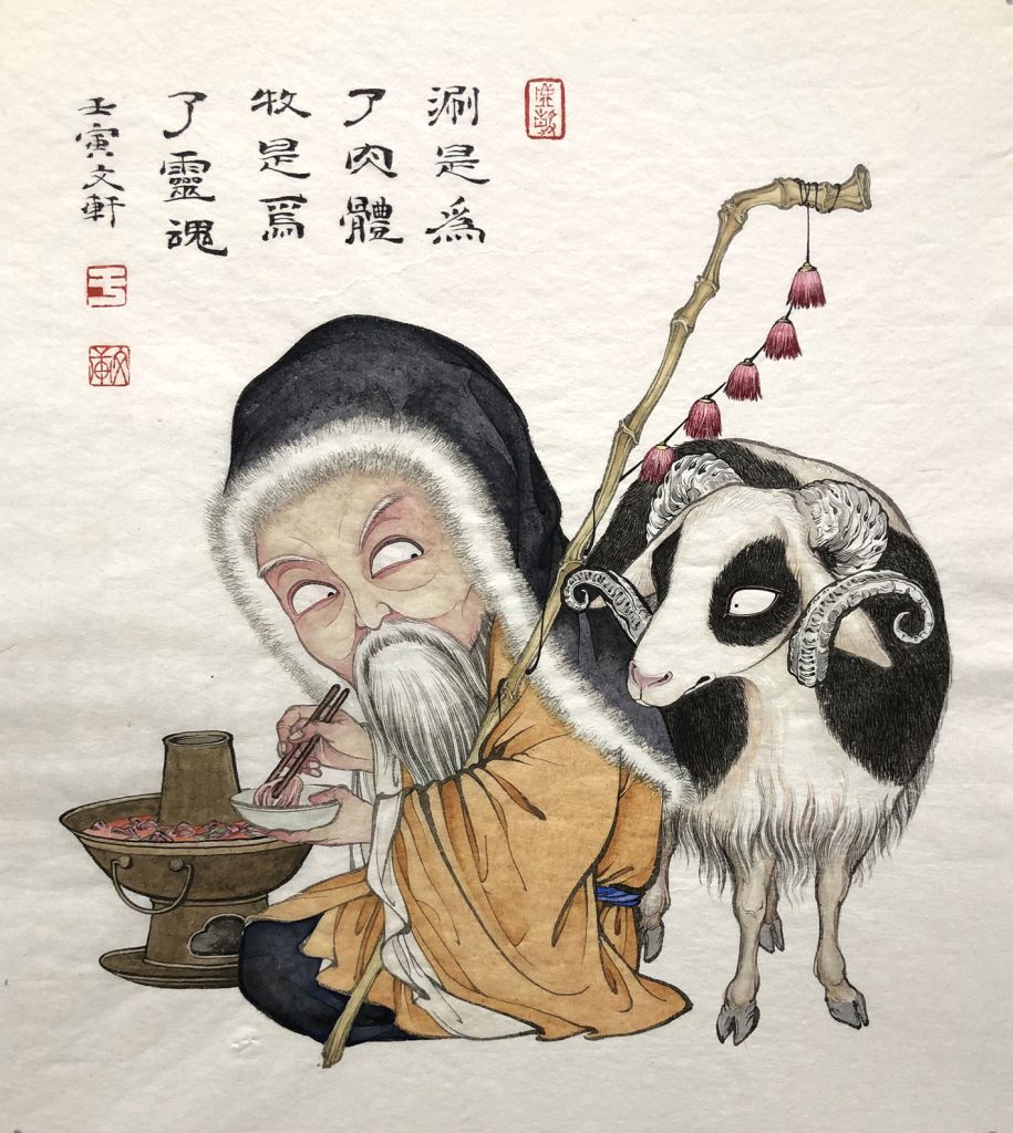 渐进不惑之年,若还不信命,只能说参悟不精,处世不深。年轻人是绝不信这套迷信蛊惑之词的。以前我也如此:一个人的成功定是自己奋斗的结果;追求理想对象,也一定是通过不懈努力而得。然大疫三年以来,通过身边的巨大变化,开始思考……有些人水平、智力、意志、品质都远不如己,却少年得志平步青云……出身、门第这些儒家早已给出了答案。孔子说“不知命,无以为君子”。人的富贵,贫贱跟人生意义无关,无论处境何地,都要活出生命的精彩。按照命理学解释即八字已注定,认同知命。再看当下的房奴,躺平,剩男剩女,子女教育……沉沉浮浮,云云如是。富贵并不等于幸福,贫贱亦不等于痛苦,兴之所至,心之所安,勿谋虚逐妄,君子真乐,皆自内心。 命理即八字,八字对干支,生肖文化历经千年至今,从出生便与每个人发生关联,也是历代画家所热衷表现的题材,把动物生肖人文符号化,以当下热点话题解释对命理的理解,感悟,多拾人牙慧。付诸笔端,才是创作之初衷。 至于画面的荒诞形式感,源于2021年《戏剧化丹青》展览。用京剧中的生、旦、净、末、丑经典戏剧形象,表现西方的十二星座,漫画的幽默性,讽刺性,反衬现实生活,又更直观诠释画面。无论西方的星座还是东方的生肖文化,都是总结命理规律,让人看清自我,热爱生命,活出精彩。· 生肖 ·