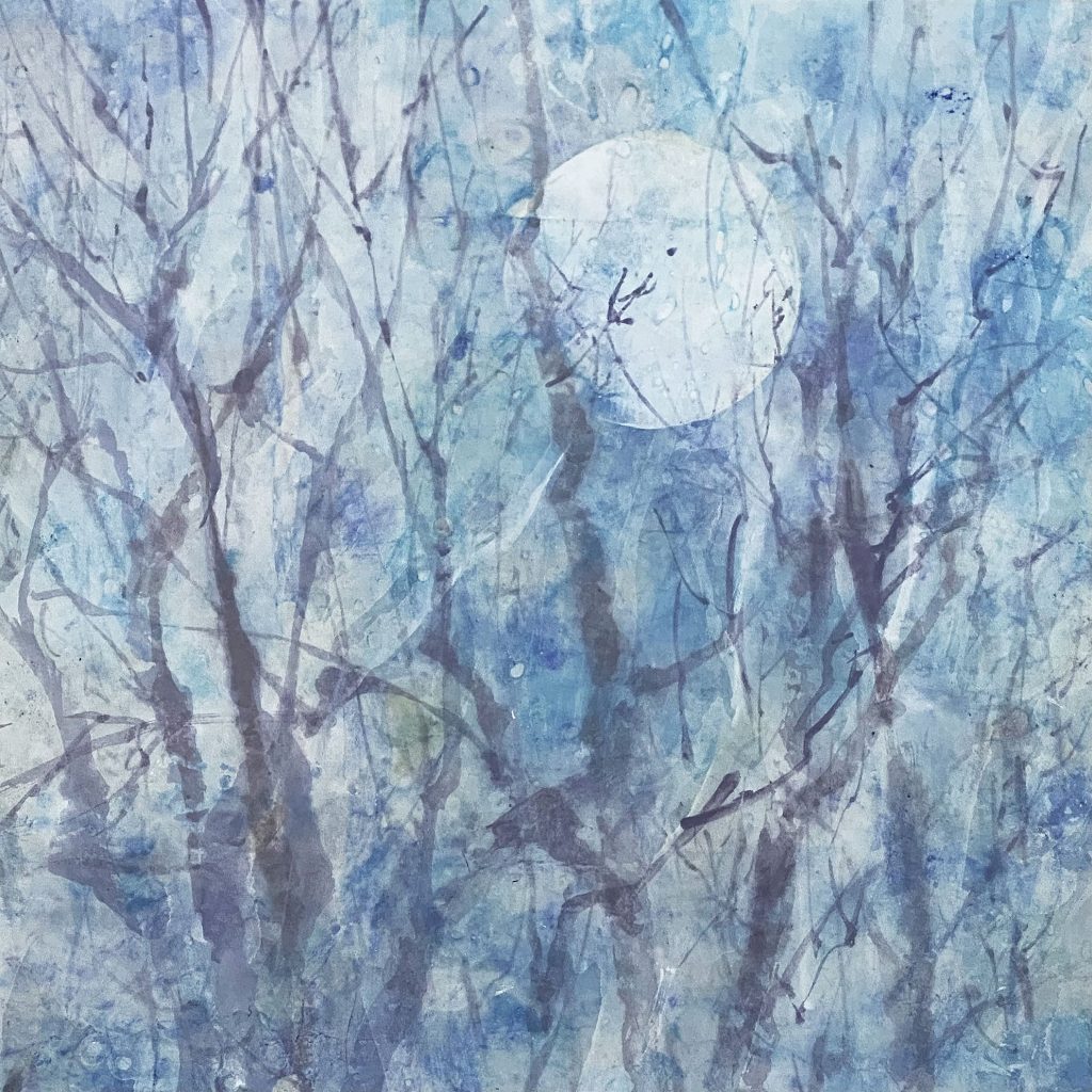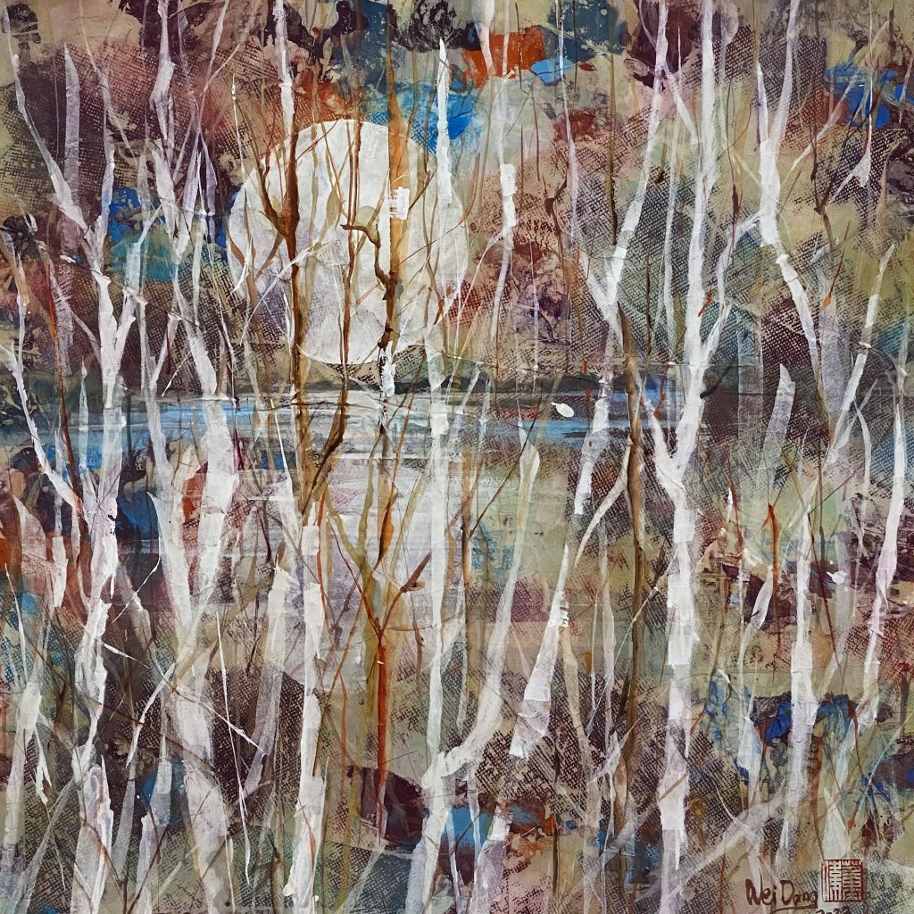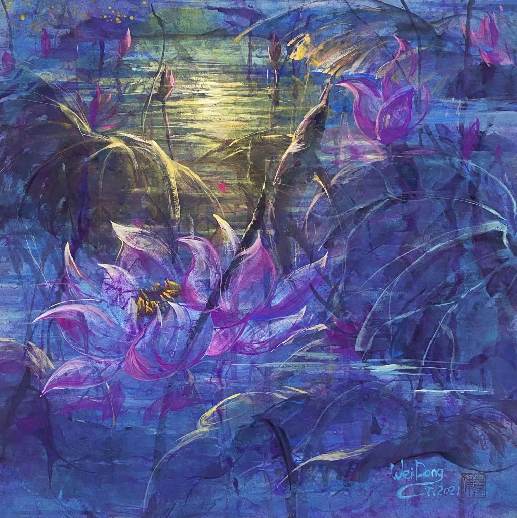 月亮在作品中被赋予了纯洁、神秘的特质。这不仅是因为月亮在夜空中散发着清新、皎洁的光芒,更因为月亮在中国文化中代表着一种超脱世俗、追求内心净化的精神境界。通过董伟教授的画作,我们仿佛可以感受到这种淡然自若和超然物外的境界,从而对生活有更深的体悟。