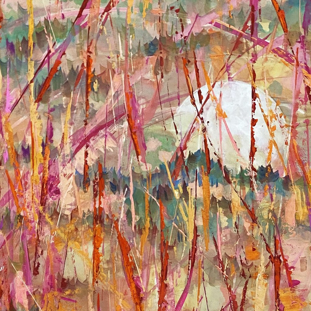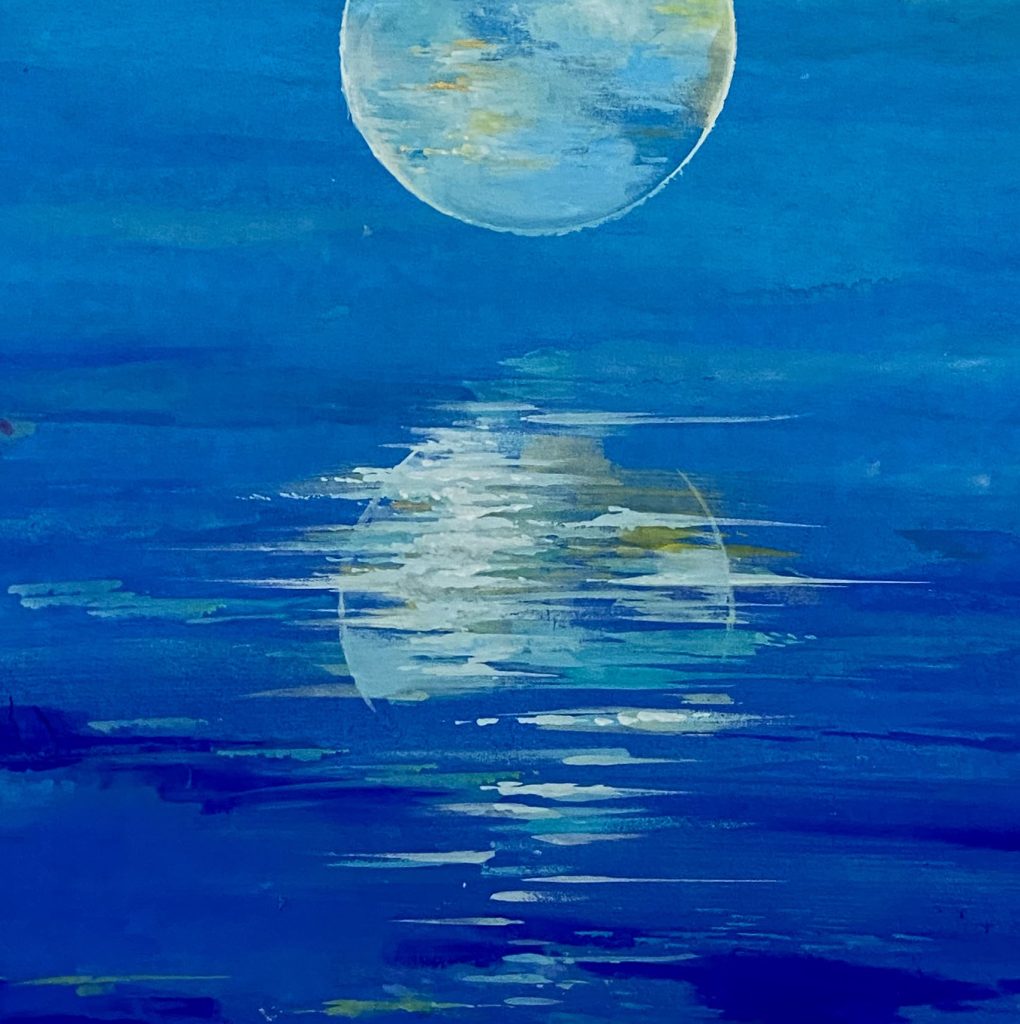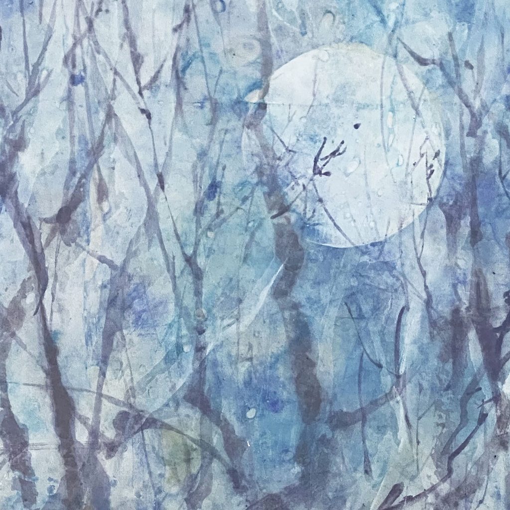 月亮在作品中被赋予了纯洁、神秘的特质。这不仅是因为月亮在夜空中散发着清新、皎洁的光芒,更因为月亮在中国文化中代表着一种超脱世俗、追求内心净化的精神境界。通过董伟教授的画作,我们仿佛可以感受到这种淡然自若和超然物外的境界,从而对生活有更深的体悟。
