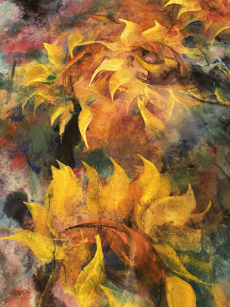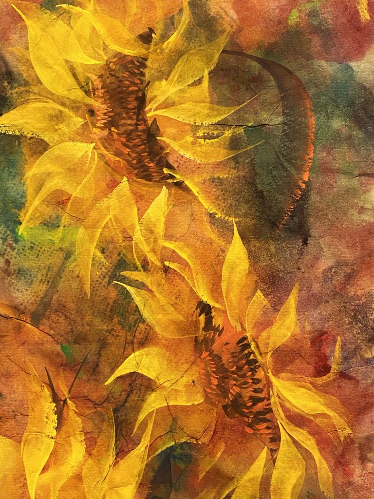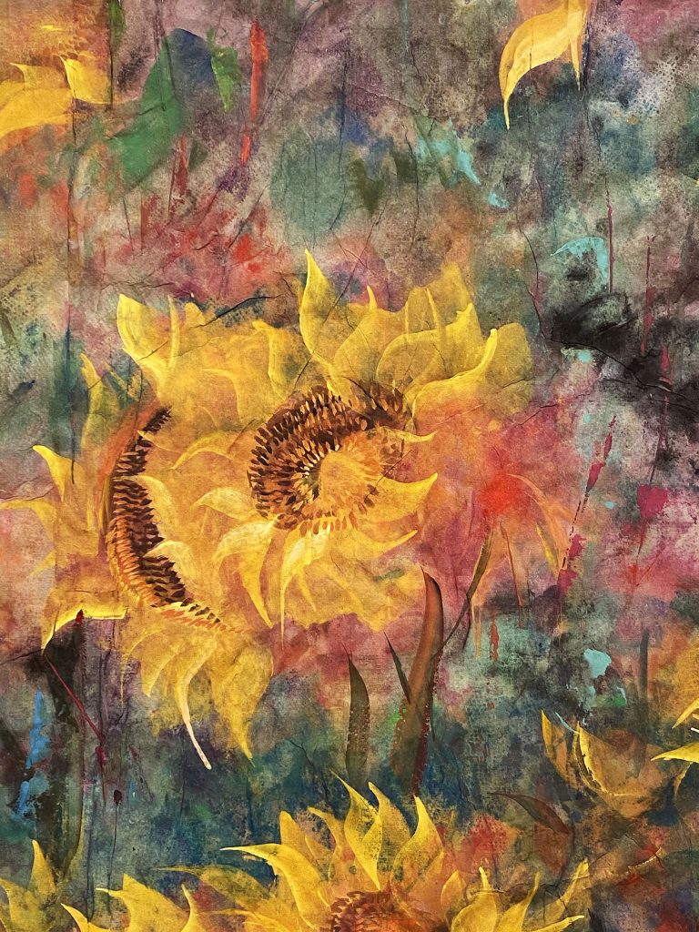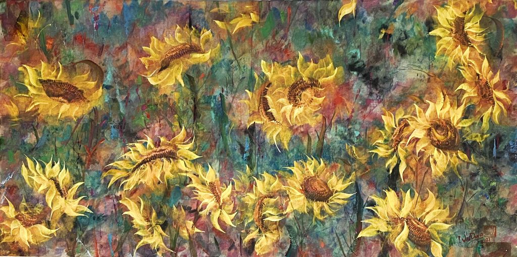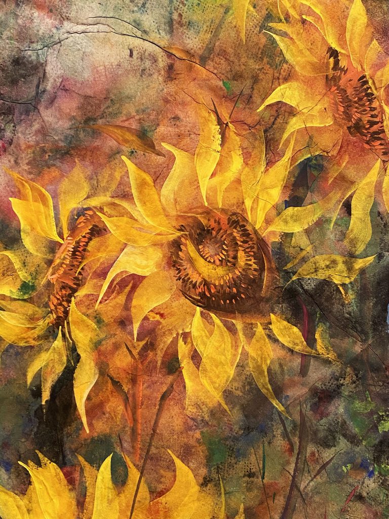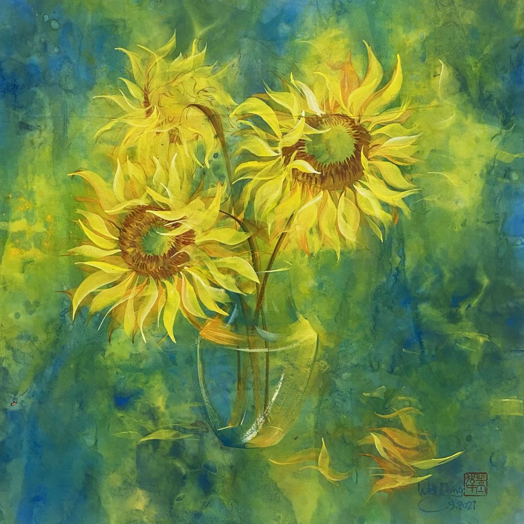 他将传统绘画技法与现代审美完美融合,创作出了一幅幅令人叹为观止的艺术佳作。在色彩运用上,董伟教授展现出了极高的造诣。他以鲜明的黄色为主调,辅以柔和的绿色和温暖的橙色,构建出了一幅幅充满阳光和活力的画面。这种色彩搭配不仅凸显了向日葵的绚烂多彩,还赋予了作品极强的情感表达力,使观者仿佛能感受到那从画中透出的温暖和希望。