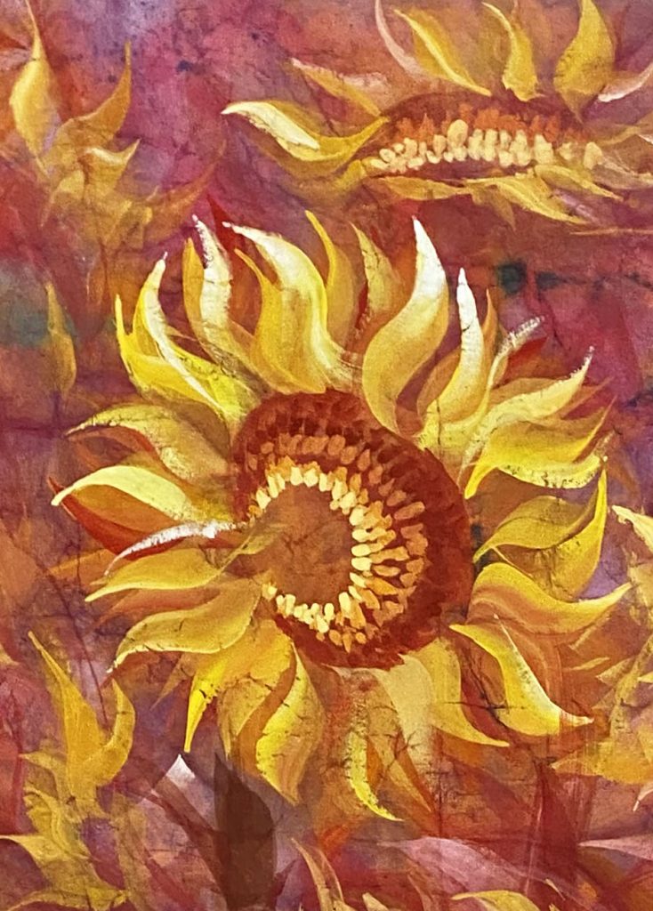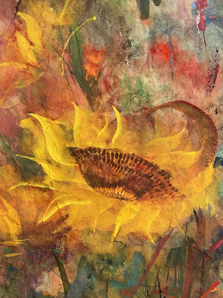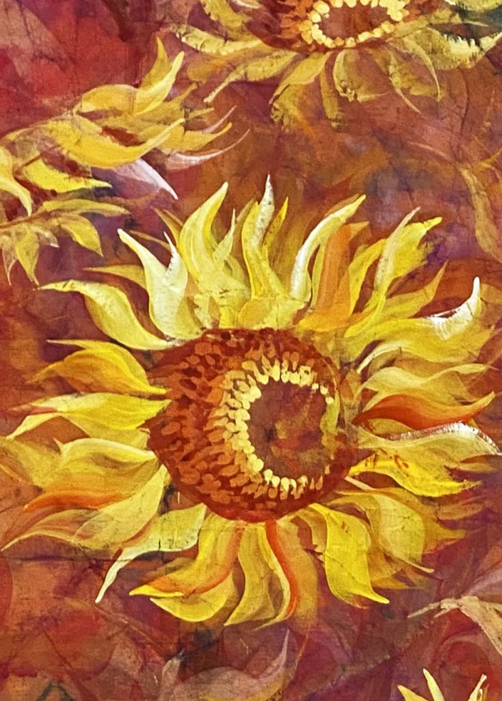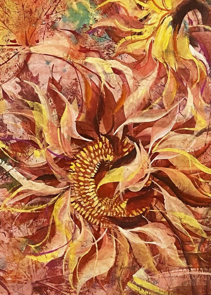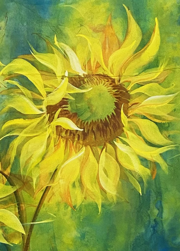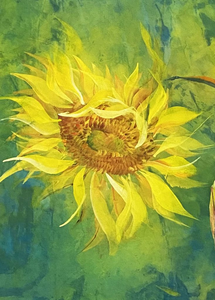他将传统绘画技法与现代审美完美融合,创作出了一幅幅令人叹为观止的艺术佳作。在色彩运用上,董伟教授展现出了极高的造诣。他以鲜明的黄色为主调,辅以柔和的绿色和温暖的橙色,构建出了一幅幅充满阳光和活力的画面。这种色彩搭配不仅凸显了向日葵的绚烂多彩,还赋予了作品极强的情感表达力,使观者仿佛能感受到那从画中透出的温暖和希望。