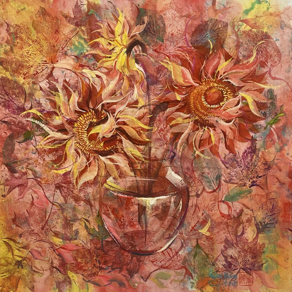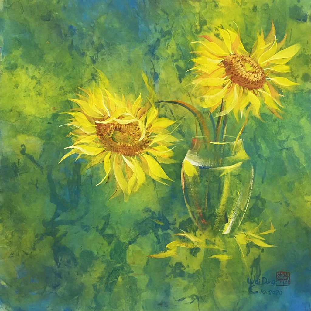 值得一提的是,董伟教授在绘画过程中还融入了自己对艺术和生活的深刻理解。他通过画笔将自己的情感和思考注入到作品中,使得每一幅作品都充满了独特的艺术魅力和精神内涵。这种艺术与情感的完美结合,使得董伟教授的作品不仅具有极高的艺术价值,更成为了一种心灵的疗愈和精神的寄托。向日葵NO.5 68×68cm 纸本设色 2021年